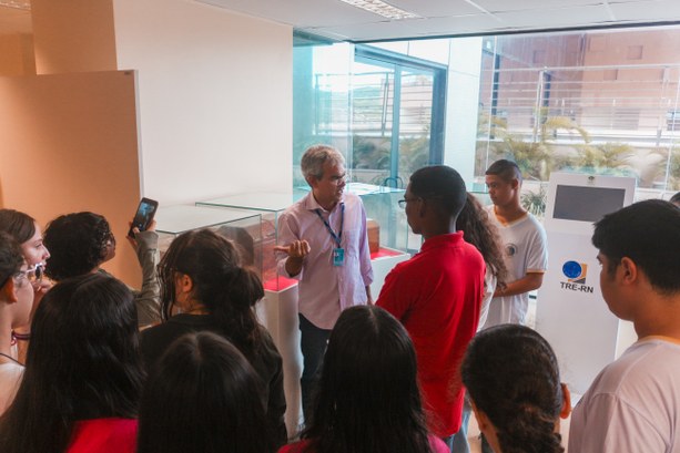 Em seguida, as turmas seguiram para o prédio da sede do TRE-RN, cujo momento foi guiado pelo servidor Solon Almeida, da Escola Judiciária Eleitoral (EJE), e pelo estagiário do Núcleo do Centro de Memória (NCEM), Adenilton Nascimento. Na ocasião, os alunos foram apresentados ao pioneirismo das mulheres na história do voto feminino, através das trajetórias de Celina Guimarães, primeira mulher eleitora, e Alzira Soriano, primeira prefeita eleita, no Brasil e no RN.