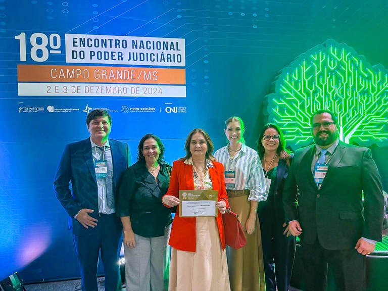 O resultado do Prêmio CNJ de Qualidade 2024 foi divulgado na manhã desta terça-feira (3), pelo Conselho Nacional de Justiça (CNJ) durante o 18.º Encontro Nacional do Poder Judiciário, que aconteceu no Centro de Convenções Arquiteto Rubem Gil de Camillo, em Campo Grande (MS). Estiveram presentes na entrega, a presidente do TRE-RN, desembargadora Lourdes Azevêdo; a diretora-geral do TRE-RN, Ana Esmera Pimentel; a assessora de gestão estratégica, governança e inovação, Ruth Hollanda; a assessora da presidência, Juliana Monte; o secretário de tecnologia da informação e eleições, Marcos Maia; e o coordenador de sistemas corporativos, Osmar Fernandes.