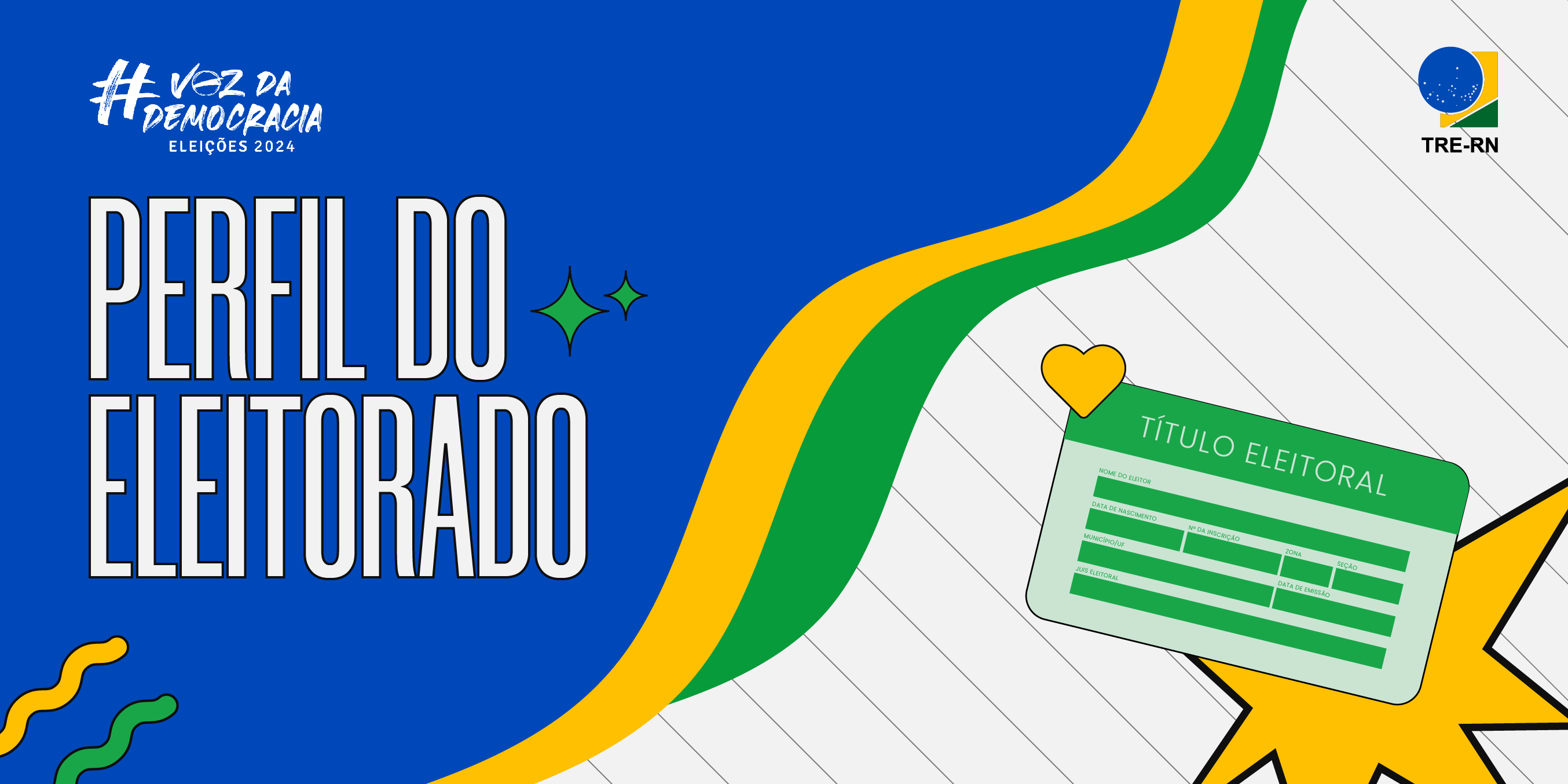 O card tem fundo azul do lado esquerdo e se projeta na diagonal até o meio. No meio, dividindo o card, há ondas nas cores amarelo e verde. Dentro da parte azul, no topo esquerdo, há a logo das Eleições 2024, #Vozdademocracia, e a baixo o título: "Perfil do Eleitorado". Na outra metade ele é branco com listras cinzas ao fundo. No topo superior direito, a logo do TRE-RN, abaixo, o desenho de um título de eleitor na cor verde e um pequeno desenho de coração na cor amarela bem próximo ao título. Fim da Descrição.