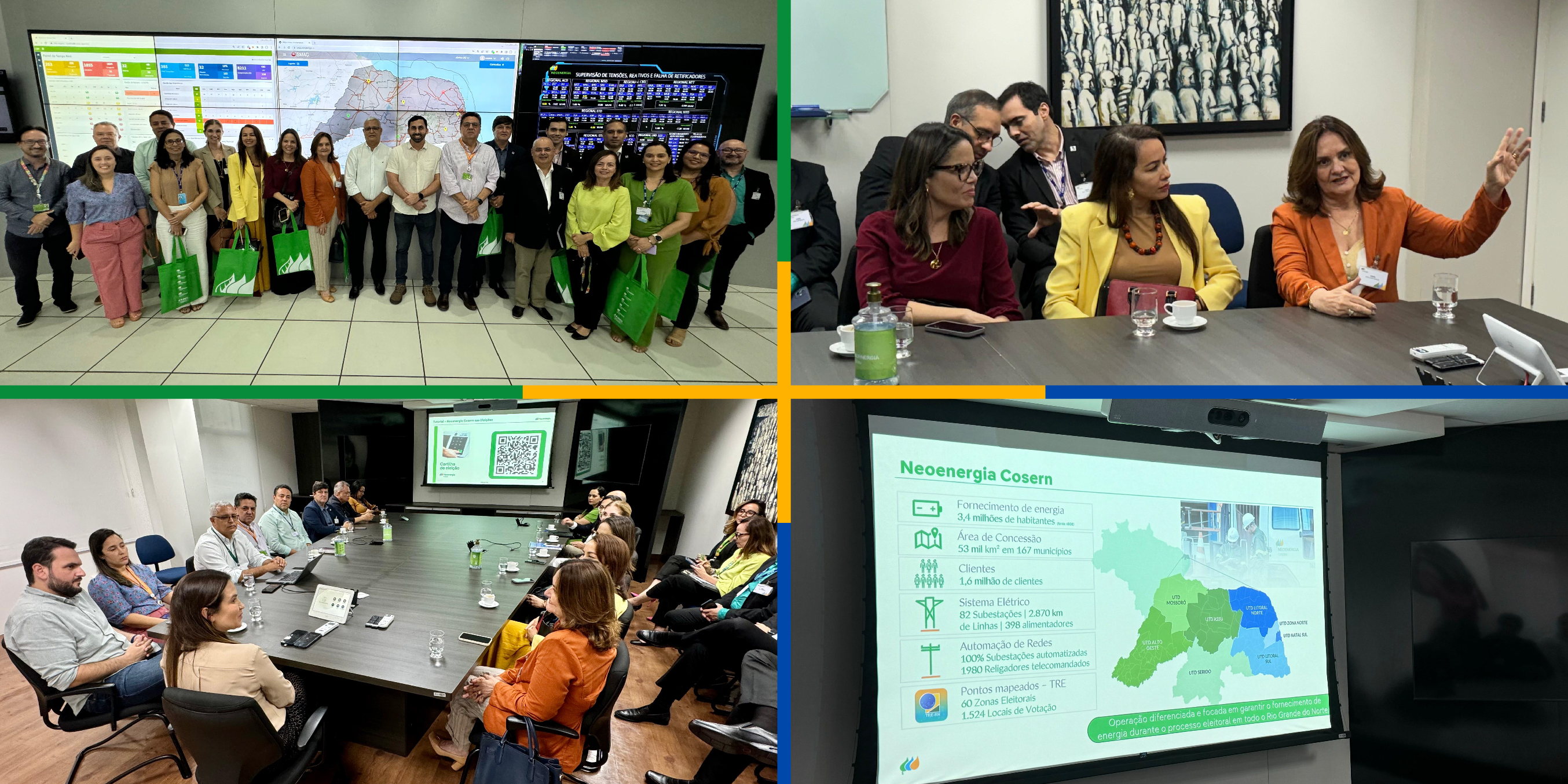 Grade com 4 fotos. A do lado superior esquerdo, pega em ângulo aberto, várias pessoas posando para a foto a frente de telas grandes que mostram uma sala de controle do grupo Neoenergia. Na foto está a presidente do TRE-RN, desembargadora Lourdes Azevêdo, secretários, assessores e outros servidores do TRE-RN. Abaixo, todos sentados em uma mesa de reunião junto com a presidente da empresa e funcionários que explicam em uma projeção, o planejamento para distribuição energética para as Eleições 2024. A foto do lado superior direito mostra a desembargadora Lourdes mais ao lado direito e ao lado dela, a juíza auxiliar, Dra. Ana Paula Nunes, e a assessora jurídica, Juliana Monte. Por trás, dois servidores de ternos pretos, conversam. Abaixo, uma foto de uma projeção mostrando dados apresentados pela COSERN. Fim da descrição.