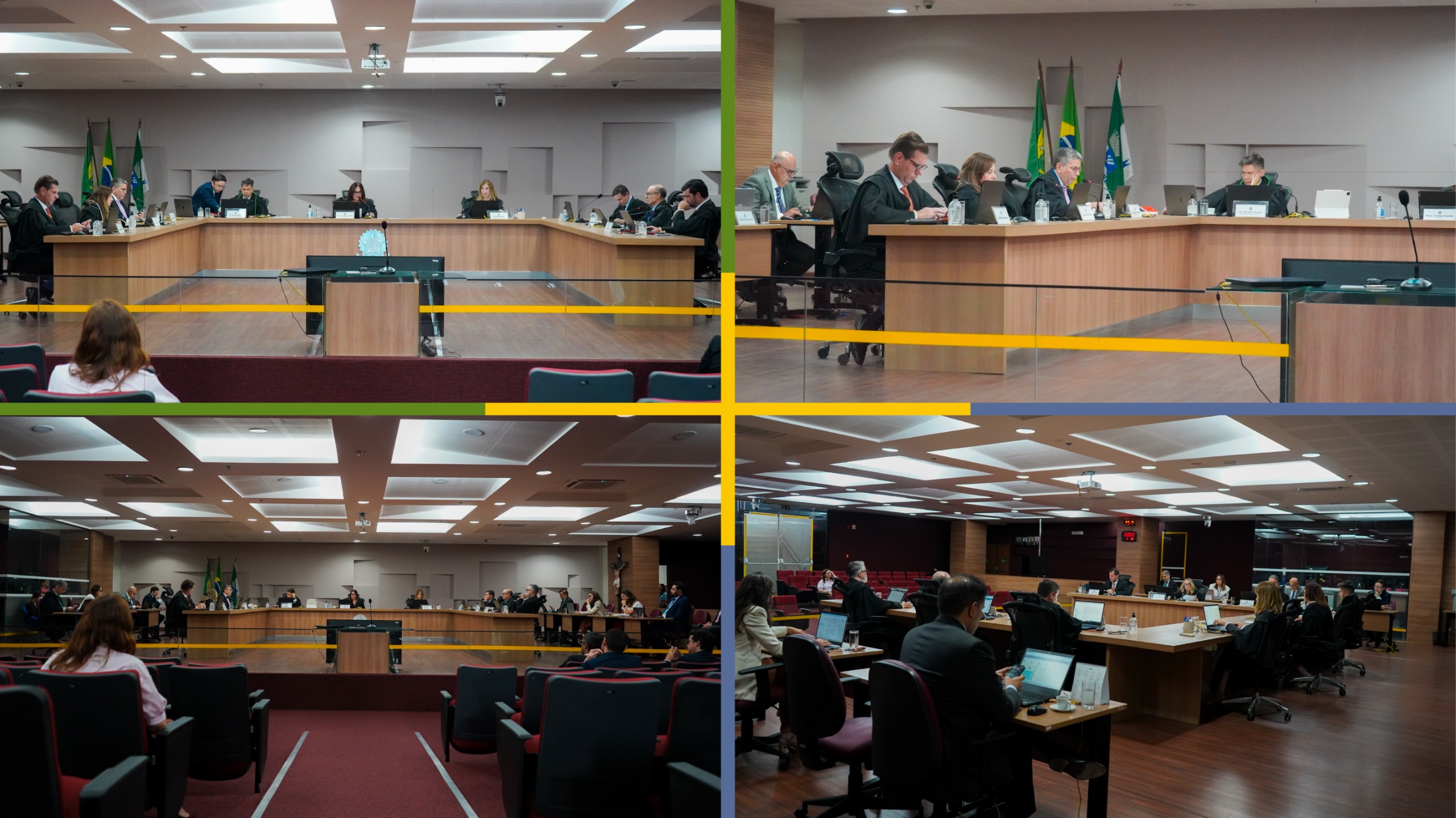 Colagem em formato 2x2 de quatro fotos de sessões judiciais em tribunais brasileiros, com mesas em U ou retas ocupadas por juízes, desembargadores e servidores em togas pretas e ternos formais. Destaque para bandeiras do Brasil e do Rio Grande do Norte ao fundo, iluminação fluorescente, cadeiras vermelhas ou pretas, laptops sobre as mesas e ambientes amplos com paredes claras. As imagens capturam momentos de debates e audiências em plenário moderno.