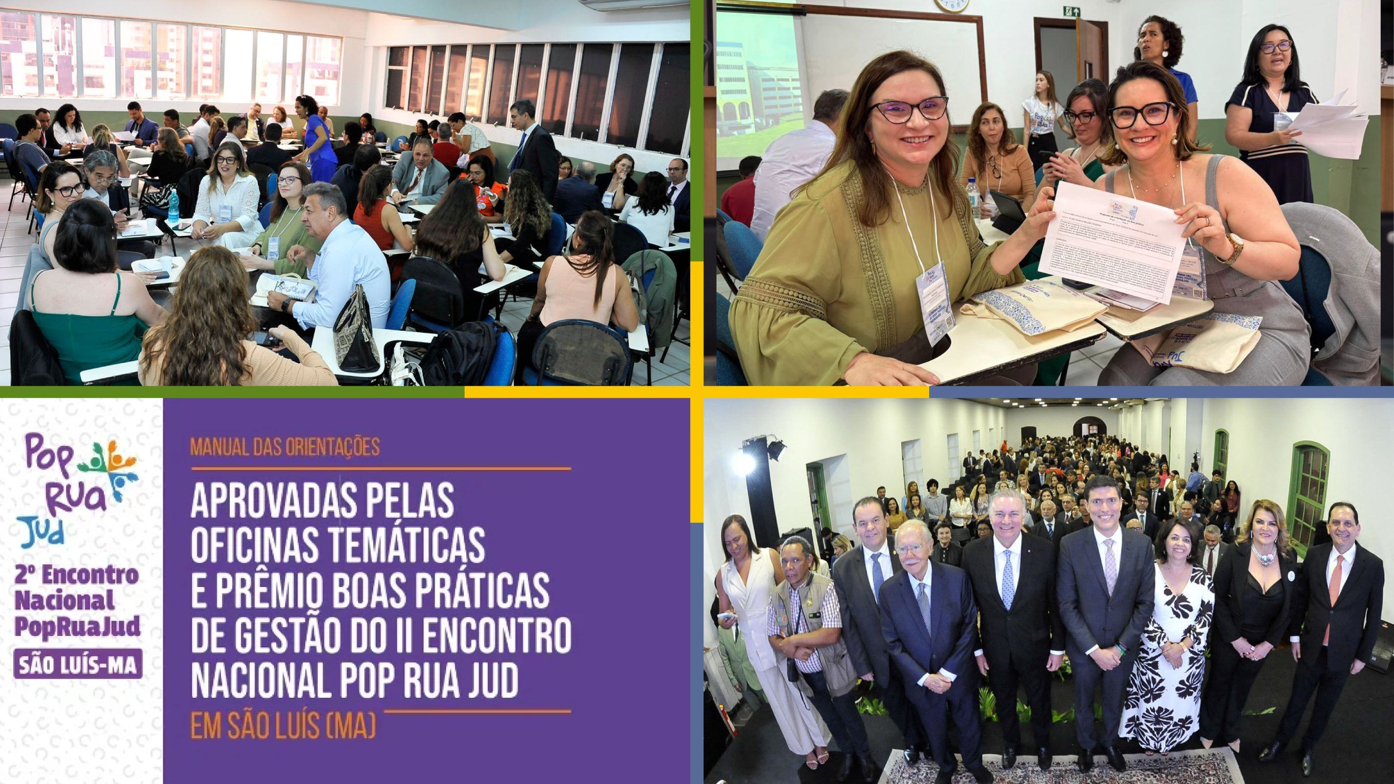 A imagem é uma colagem dividida em quatro partes que registram a participação em um encontro institucional. No quadrante superior esquerdo, vê-se uma sala de aula ou auditório repleto de pessoas sentadas em círculos de discussão, sugerindo uma oficina de trabalho colaborativa. No quadrante superior direito, duas mulheres sorriem para a câmera enquanto uma delas segura um documento oficial impresso. O quadrante inferior esquerdo apresenta um print de uma notícia com o título "Manual do CNJ destaca prática da Seção Judiciária do DF premiada com projeto para população em situação de rua", acompanhado pela identidade visual do projeto PopRuaJud. No quadrante inferior direito, uma mulher com óculos de armação escura fala ao microfone em um momento de apresentação ou debate.