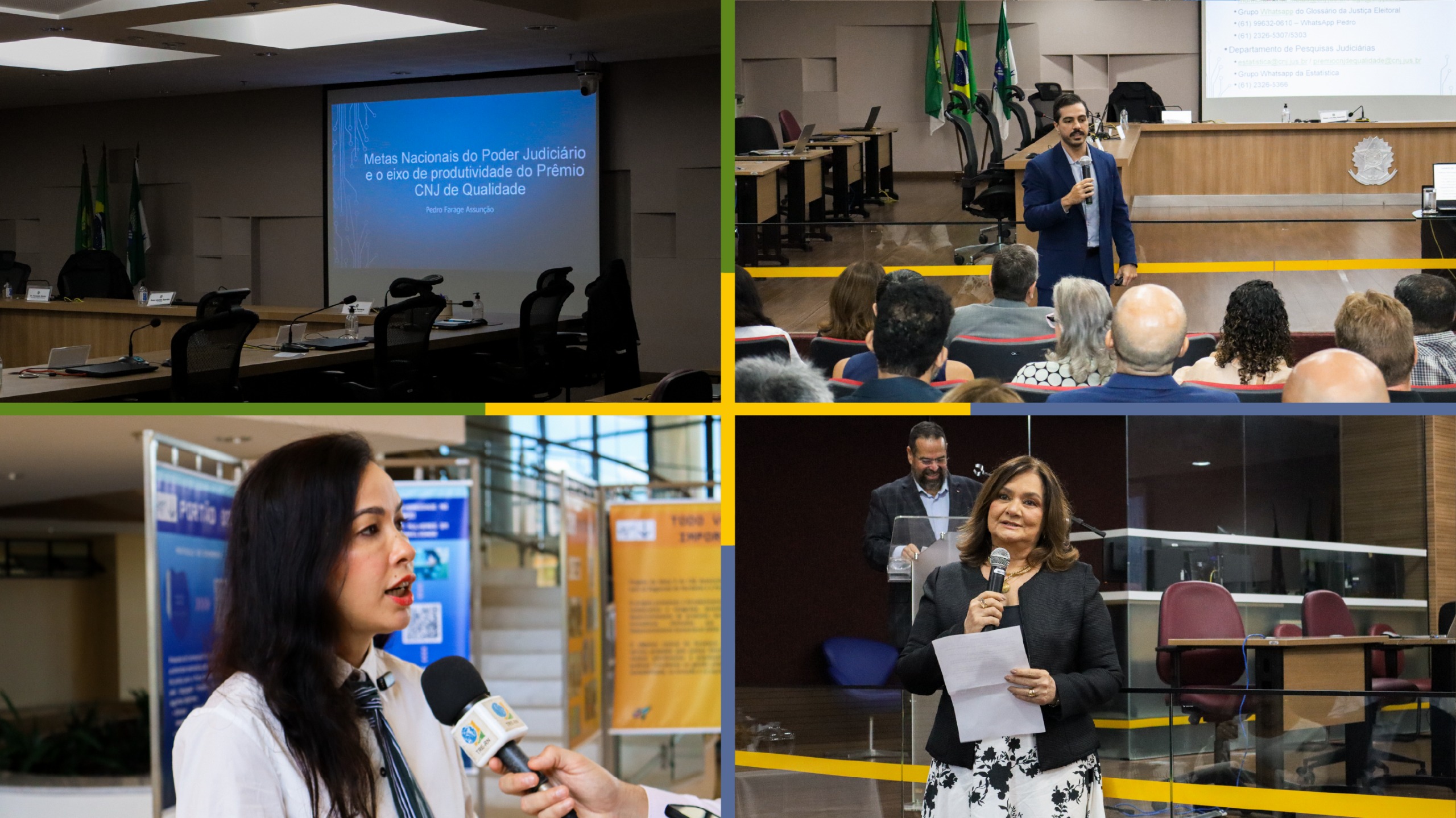 Superior direito: Plenário com homem de terno azul palestrando, tela com "Metas Nacionais do Poder Judiciário", plateia atenta, bandeira do Brasil.