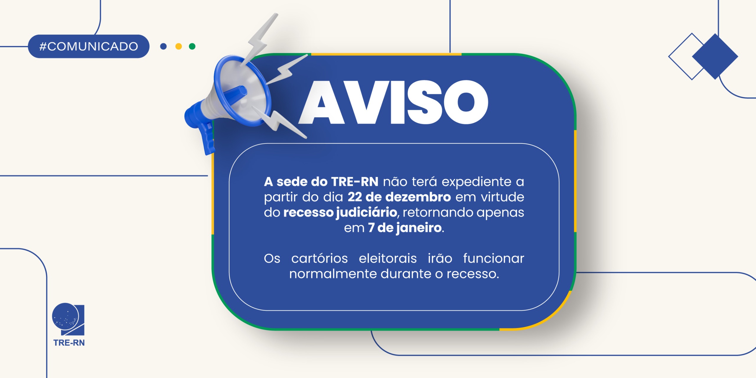 Card institucional em fundo claro com detalhes em azul, verde e amarelo. No centro, um retângulo azul com cantos arredondados traz a palavra “AVISO” em destaque, acompanhada do ícone de um megafone. O texto informa que a sede do TRE-RN não terá expediente a partir de 22 de dezembro, em razão do recesso judiciário, com retorno em 7 de janeiro, e que os cartórios eleitorais funcionarão normalmente durante o recesso. No canto inferior esquerdo, aparece a logomarca do TRE-RN.