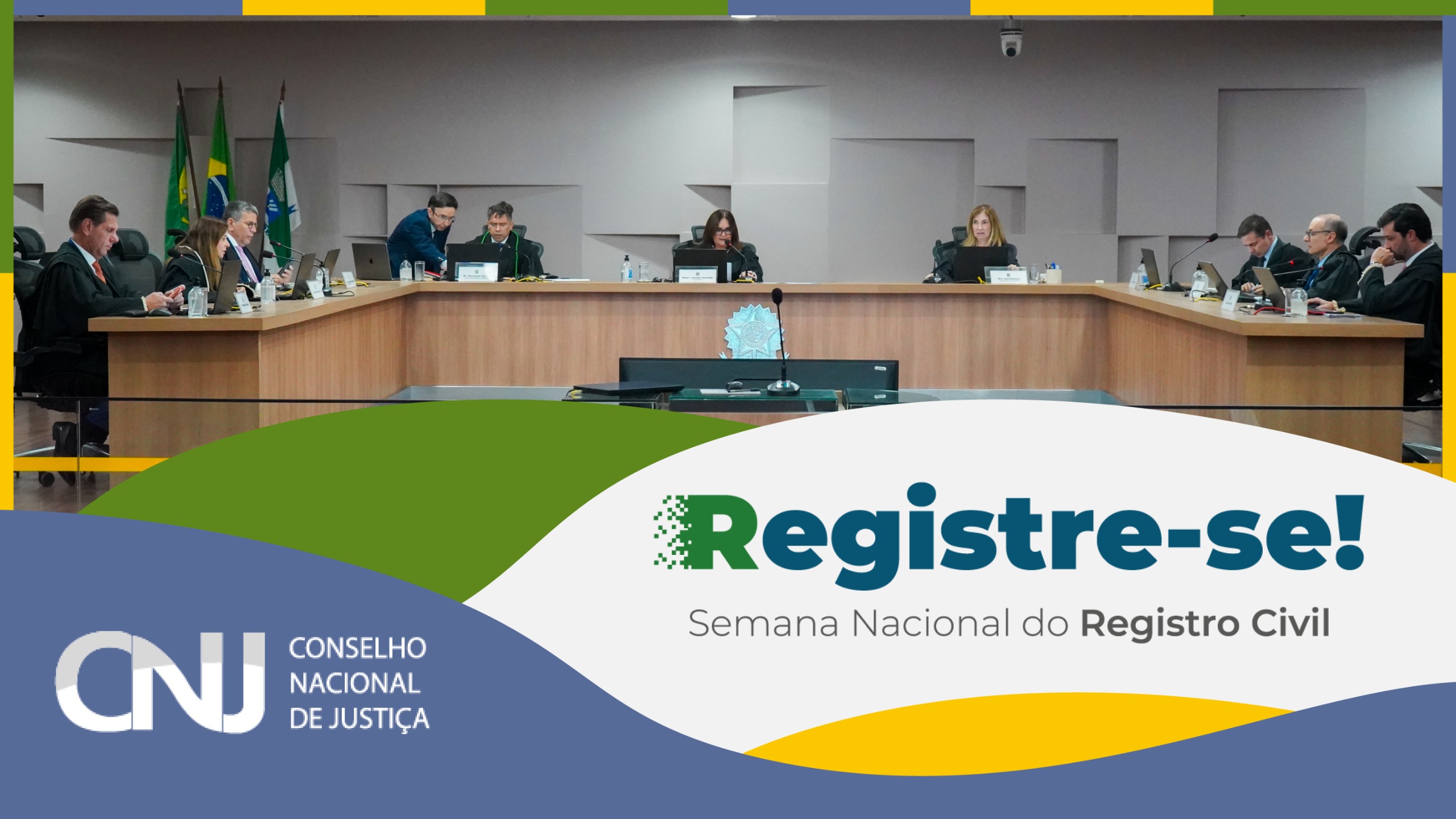 Foto oficial de uma sessão do Pleno do TRE-RN, com mesa em formato de U ocupada por magistrados e autoridades em ternos escuros, sentados em cadeiras com encosto alto. A borda inferior apresenta o banner promocional da "Semana Nacional do Registro Civil" com design em verde, amarelo e azul: logo do CNJ, texto "Registre-se!" em destaque, "Semana Nacional do Registro Civil" e logos do CNJ e Justiça.