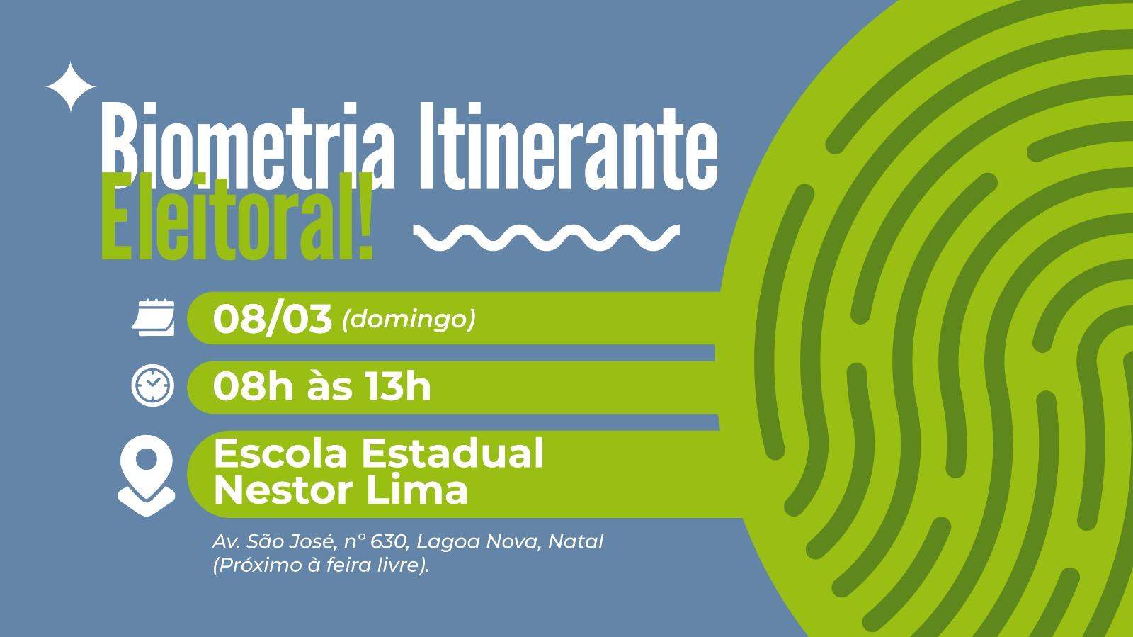 Imagem promocional da Biometria Itinerante Eleitoral do TRE-RN, em design retangular com fundo azul-claro. No topo esquerdo, título "Biometria Itinerante Eleitoral!" em letras brancas com ícone de digital verde e ondas decorativas. Centro superior: data "08/03 (domingo)" em barra verde, horário "08h às 13h" abaixo. O ícone de localização verde aponta para "Escola Estadual Nestor Lima – Av. São José, nº 630, Lagoa Nova, Natal (Próxima à feira livre)". Canto inferior direito com logotipo das Eleições 2026 e TRE-RN.