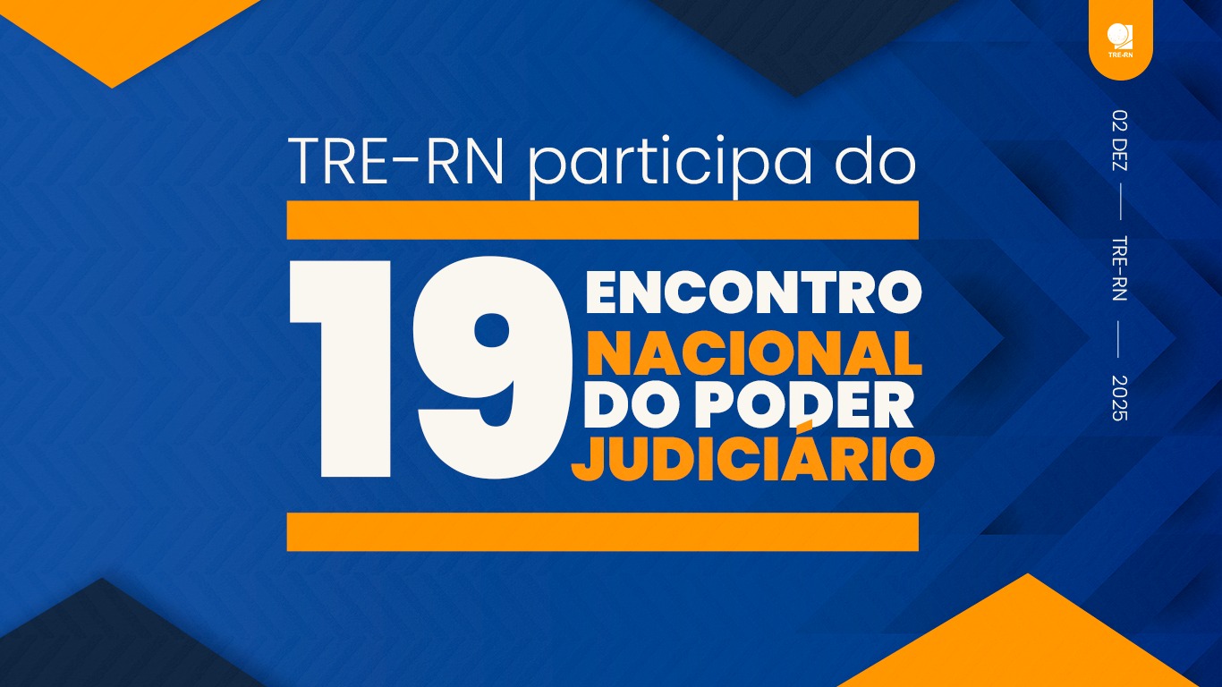 Arte gráfica em tons de azul e laranja, com formas geométricas. No centro, o texto: “TRE-RN participa do 19º Encontro Nacional do Poder Judiciário”. À direita, aparecem a data “02 dez”, a marca TRE-RN e o ano “2025”.