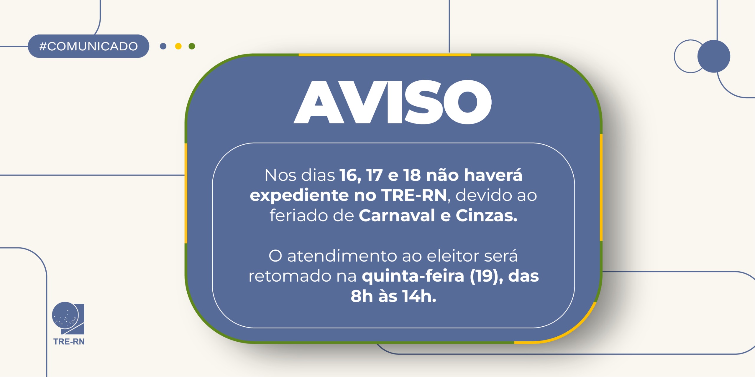 Arte com fundo branco e elementos em azul. Ao centro a mensagem: "AVISO - Nos dias 16, 17 e 18 não haverá expediente no TRE-RN, devido ao feriado de Carnaval e Cinzas. O atendimento ao leitor será retomao na quinta-feir (19), das 8h às 14h".