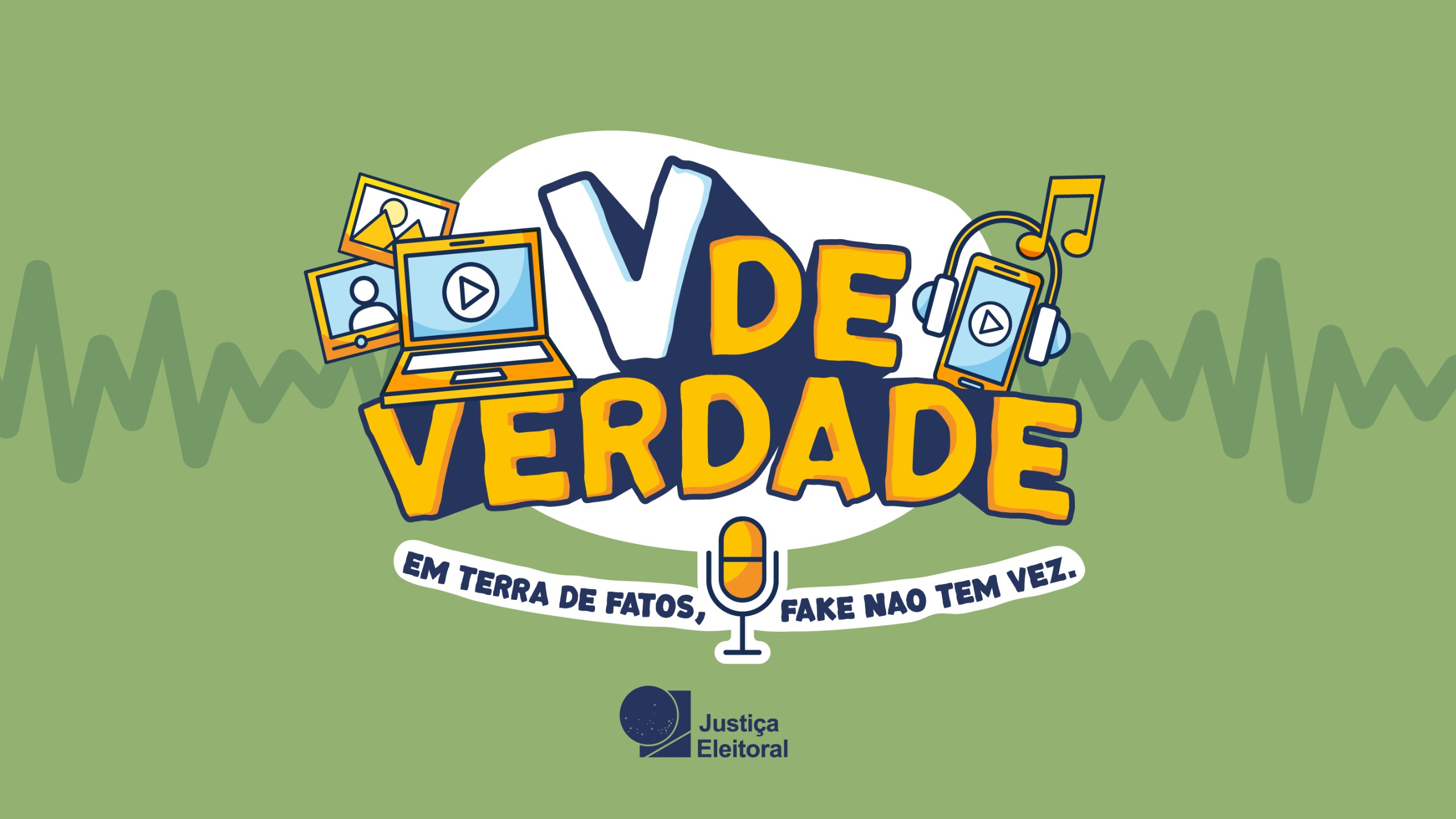 Arte com identidade visual da campanha V de Verdade - Em terra de fatos, fake não tem vez. Há elementos como imagem de modulação de som, microfone, fone, celular e notebook, com as logos da Justiça Eleitoral e das Eleições 2026.