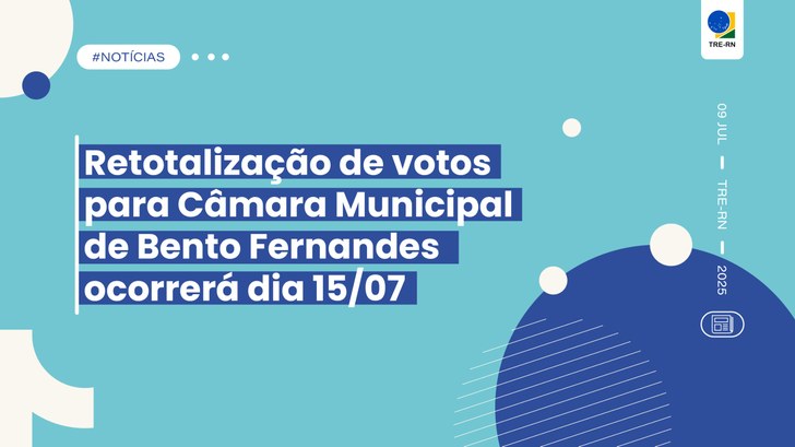 Foi publicado no Diário de Justiça Eletrônico (DJe), Edição nº 125/2025 desta quinta (10), o Edital nº 3/2025/ZE062, marcando para o dia 15 de julho, às 14 horas, a retotalização de votos no município de Bento Fernandes. O reprocessamento será feito após o Colegiado do TRE-RN ter cassado mandatos do PSOL por fraude à cota de gênero nas eleições de 2024, na sessão plenária da última terça (8).