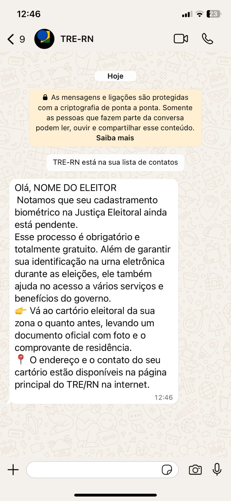 A partir do dia 22 de setembro, o Tribunal Regional Eleitoral do Rio Grande do Norte (TRE-RN) encaminhará mensagens personalizadas via WhatsApp para os eleitores que ainda não realizaram a coleta de suas digitais. A previsão é que sejam enviadas cerca de 3.600 mensagens por dia, de segunda a sexta-feira, ao longo de dois meses.